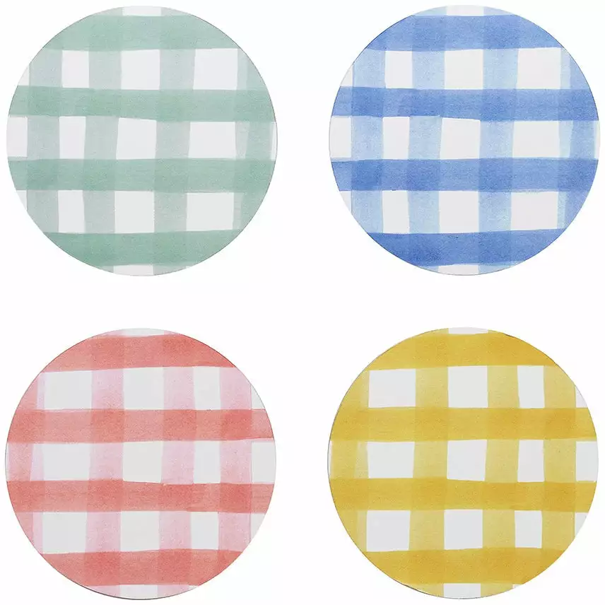 Add a traditional look to your desk, kitchen, or dining room with the Ecology Ripe Set of 4 Coasters in Gingham Round.