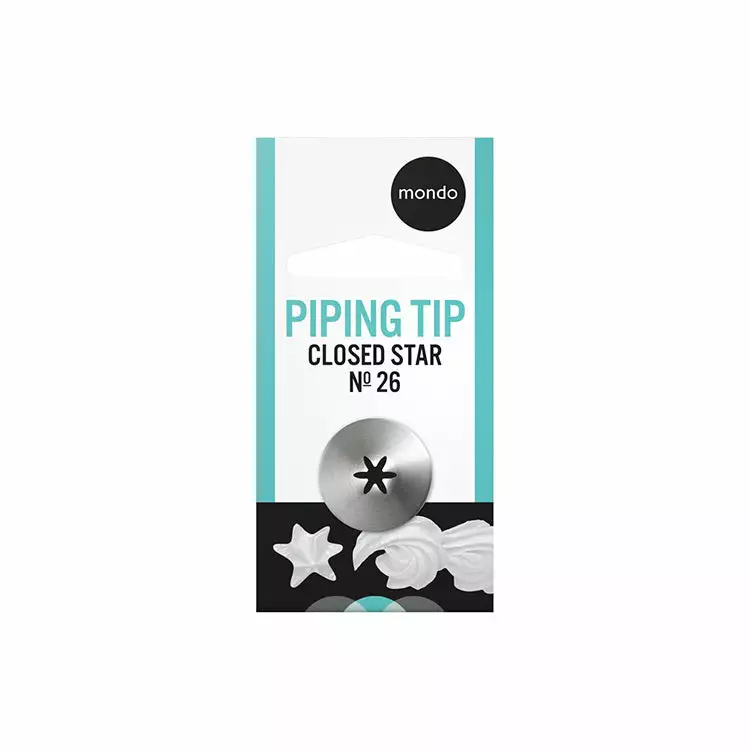 The stainless steel Mondo #26 Closed Star Piping Tip is a piping tip that may be used for making rosettes, stars, scallops, fleurs de lis, scrolls, and drop flowers. It is part of the company’s extensive food-grade piping tip collection. A regular coupler can be paired with this tip.