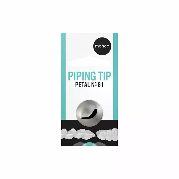 This Mondo #61 Petal Piping Tip makes decorating cakes, pies, and other baked goods simple and tons of fun! You can quickly and easily create beautiful designs on your cakes with this food-grade stainless steel icing tip. Simply add it onto a decorating icing bag.