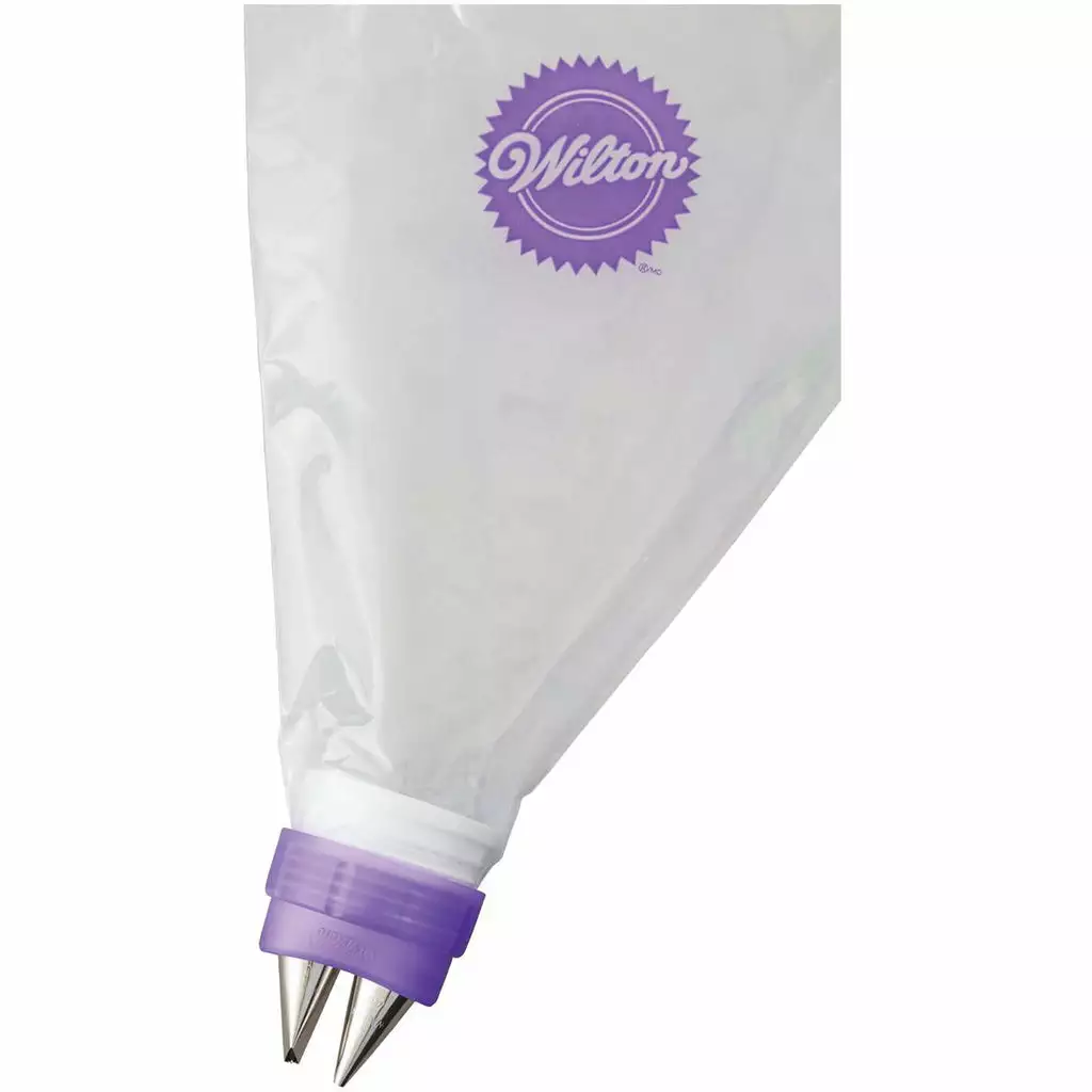 Pipe your cakes with interesting borders thanks to the Wilton Duo Tip Coupler Set. This handy coupler set allows you to pipe your frosting with two separate standard decorating tips at the same time.