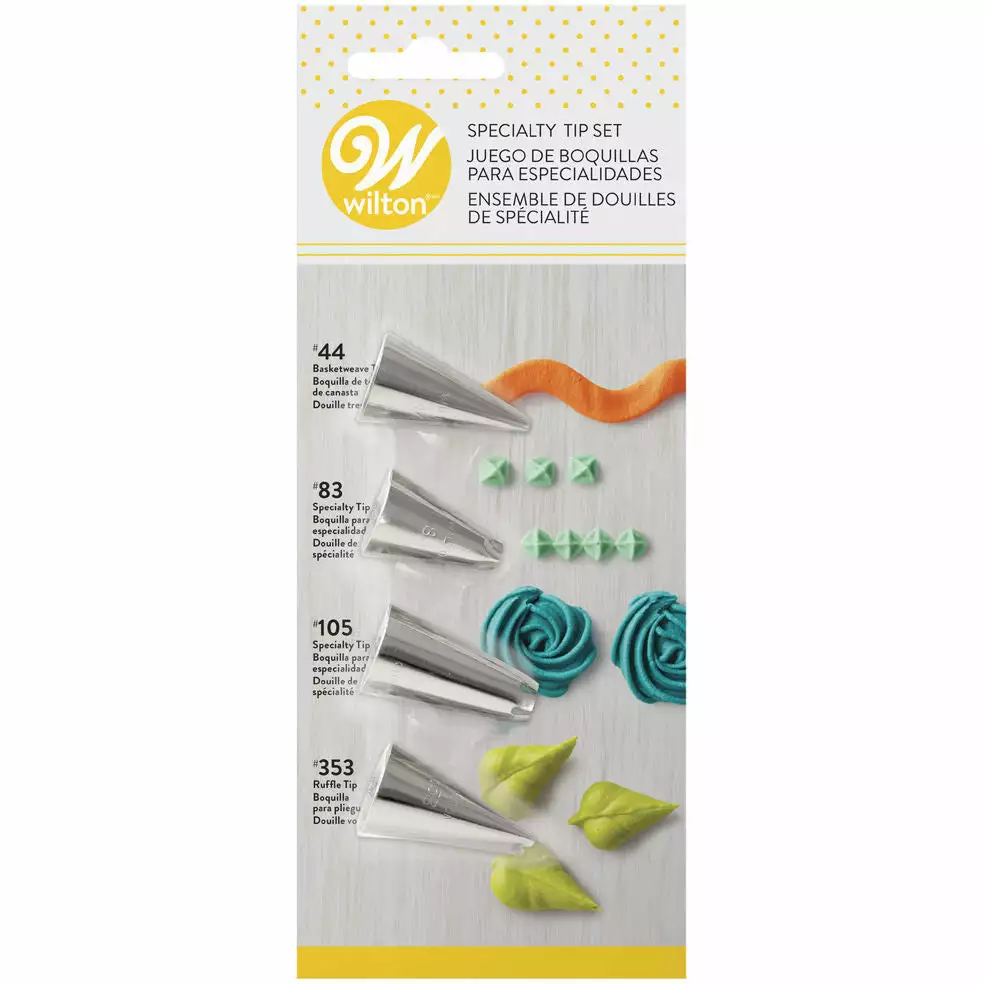 - 4-Piece Specialty Icing Tip Set gives you everything you need to create beautiful buttercream decorations